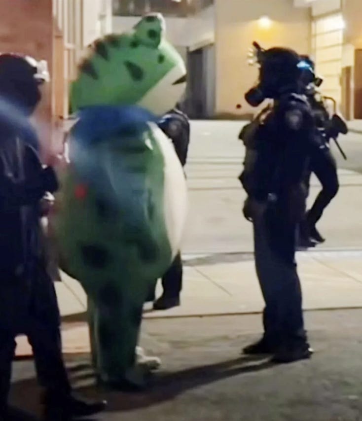 Now Portland is faced with another performative National Guard deployment no governor or mayor asked for, and that decision is being driven by whatever lens Fox News is using to broadcast the fairly spartan protests around the ICE headquarters. This is what Trump seizes on. He doesn’t see the plushy furry frog and the other costumes there, standing in front of the ICE agents. He sees chaos. Catastrophe. A world that doesn’t look like an exclusive private golf club.