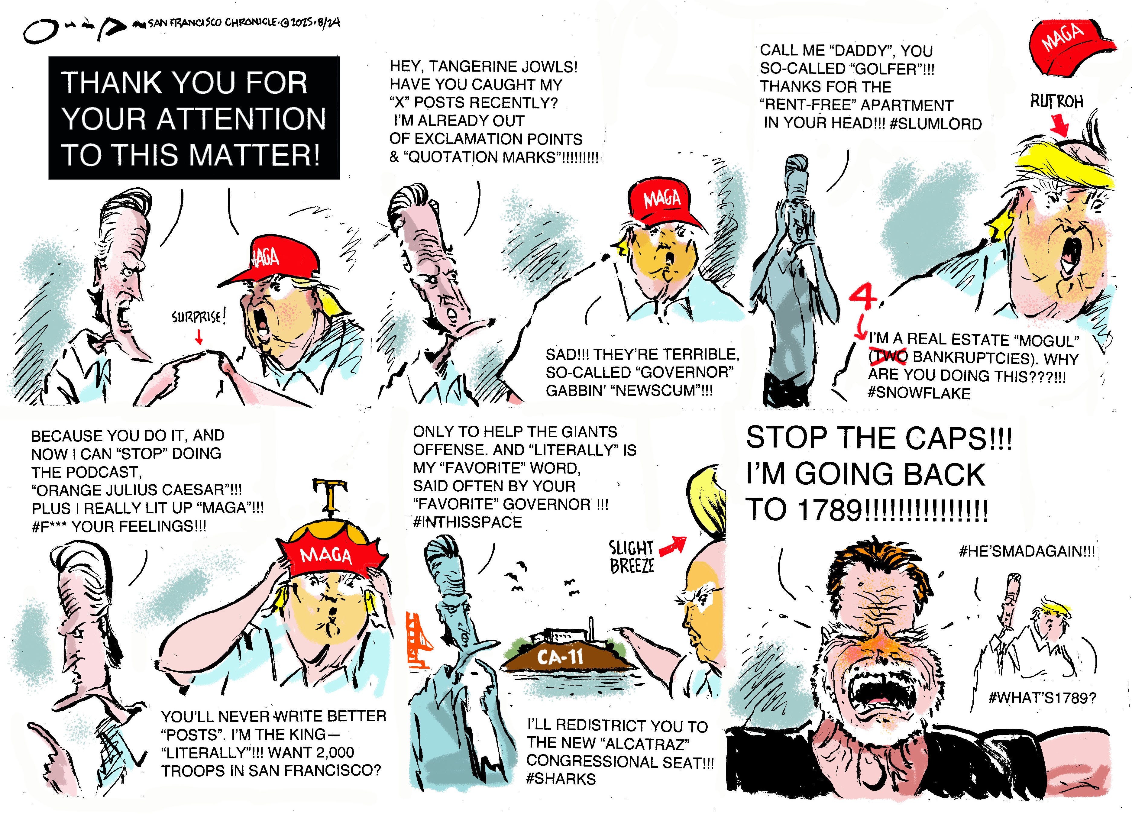 I have read a lot of parodies, and Newsom’s Trolling Tweets are up with the best material I have seen from the 1970s National Lampoon era, period. Frankly, my little effort here doesn’t hold a candle to what Newsom’s people are doing. But hey, we have to make deadlines in San Francisco, so I made a run at it. Turned out OK, but not as good as Gavin’s. I invite Gavin’s comms team to write my editorial cartoons going forward.