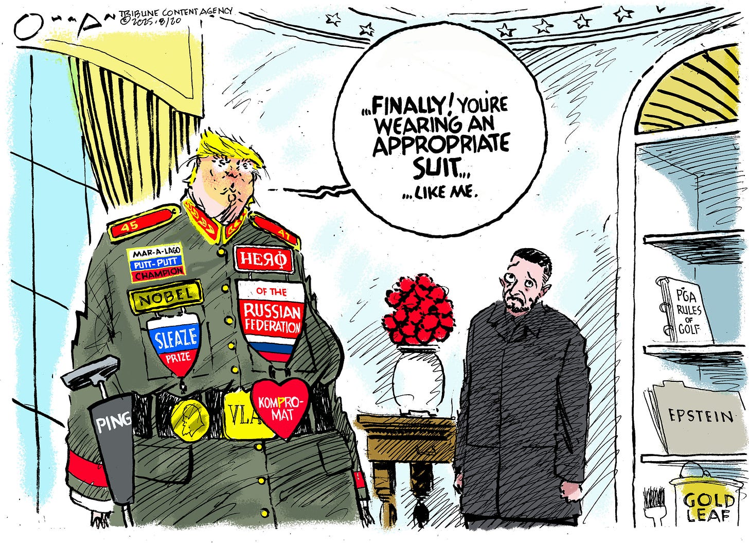 Here’s a rather colorful panel, featuring all the medals and decorations that one would bestow on this silly man child. I like to do so-called “Easter Eggs” in my cartoons, and I threw a could have little bits of tid on the the bookcase, which was also defaced by gold paint rather recently. I just want to projectile barf every time I see the what’s left of the Oval Office now.