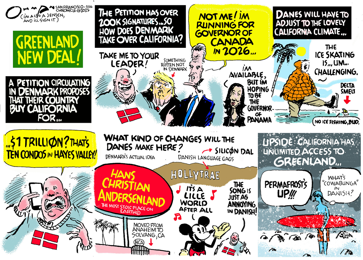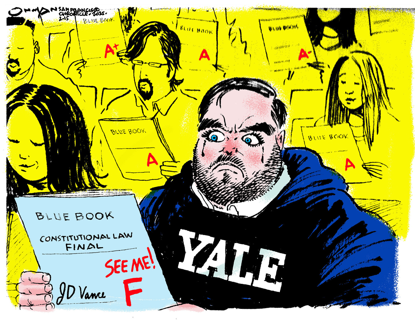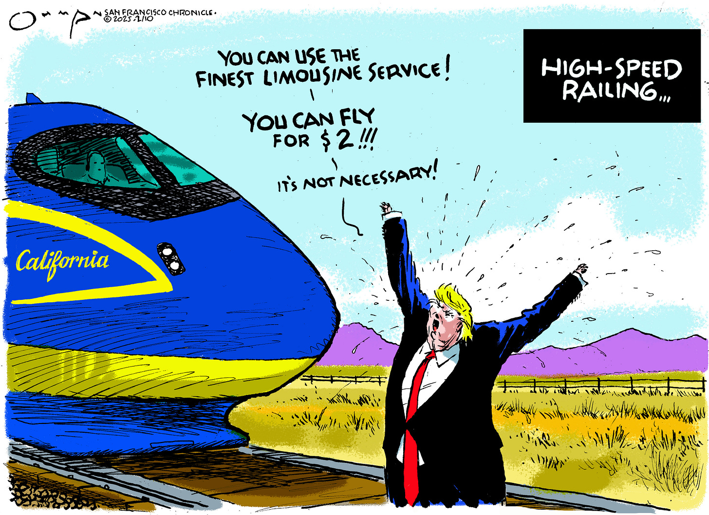 This is a California-specific cartoon for the Chronicle. Our New Dictator doesn’t like high-speed rail, which should have been built in California about 55 years ago. It’s still not finished yet, and many people say (me, and I am sure others) are puzzled that it doesn't connect San Francisco with Los Angeles—yet. Naturally, the senile idiot who happens to be the 47th president thinks anyone could “rent a limousine” and just drive to L.A. (or, actually, Bakersfield), or fly “for $2”.