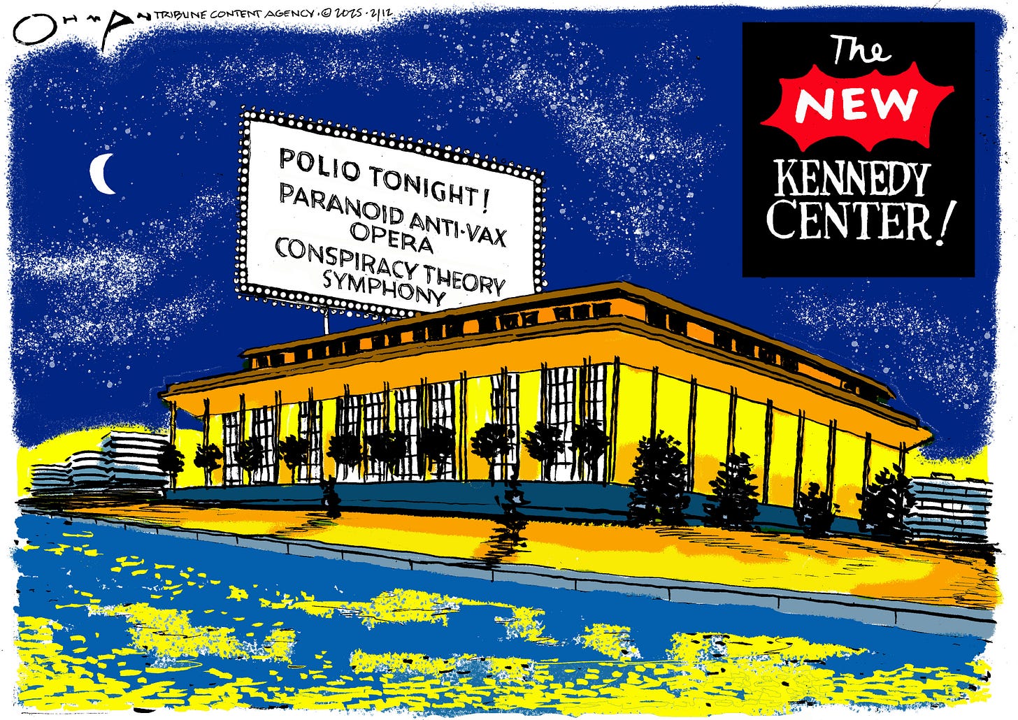 Kinda dug this one, mostly because I spent a lot of time with the lights on the Potomac. Again, this probably isn’t exact, but it’s pretty close, for a cartoon. I looked at many photographs of the Kennedy Center (I’m also writing a Substack piece on the subject, but I had a lot of schedule disruptions this past week, so it’s not quite done yet).