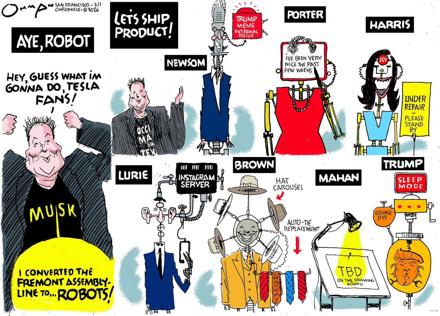 I was going to do a Super Bowl in San Francisco cartoon Thursday, but then I remembered the SB isn’t until next Sunday, so I decided to hold off for a slam- dunk subject (mixed metaphor, sorry—not a home run).