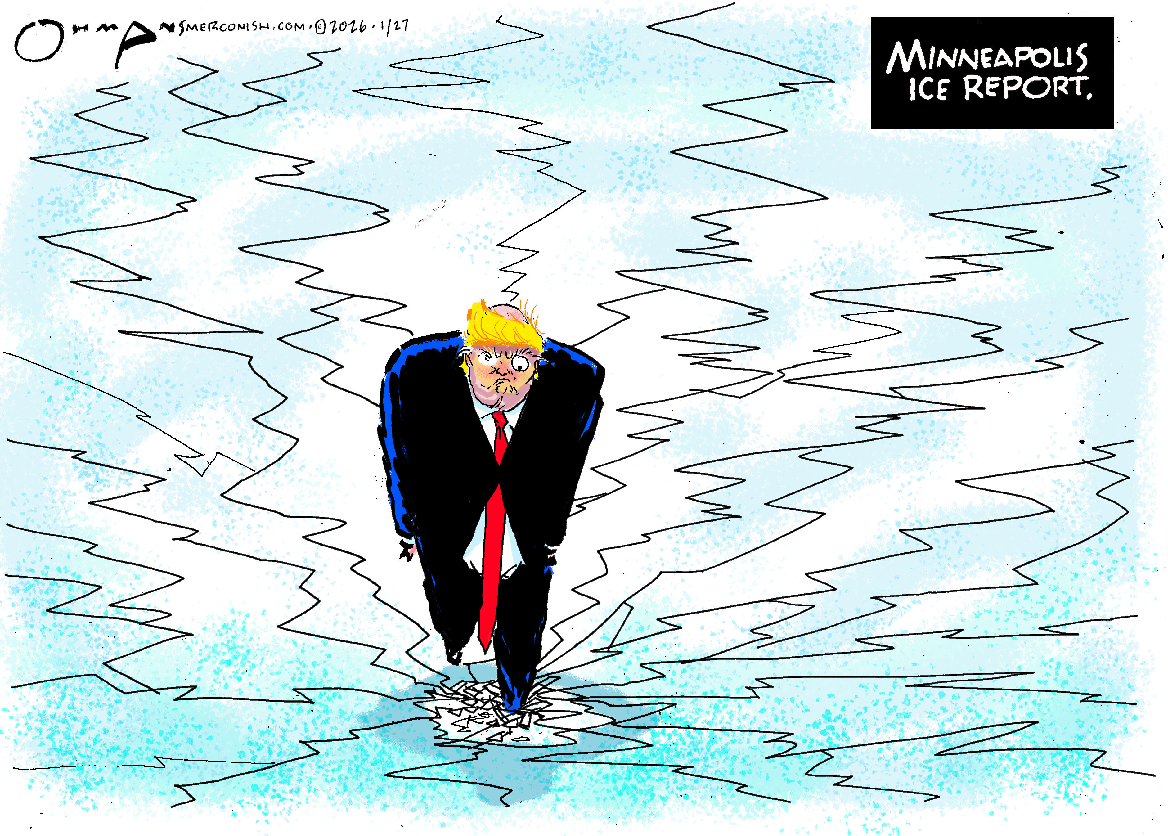 Here’s the Smerconish cartoon. I am not pretty mindful of the fact that Michael shows these on CNN, so I am now trying to make them television-screen friendly and not overly-ornate, which I tend towards, sometimes. I liked this one, and it didn’t take a whole lot of time. Did the cracks with a uniball micro in three minutes, and I was more concerned about the ice color than anything else.