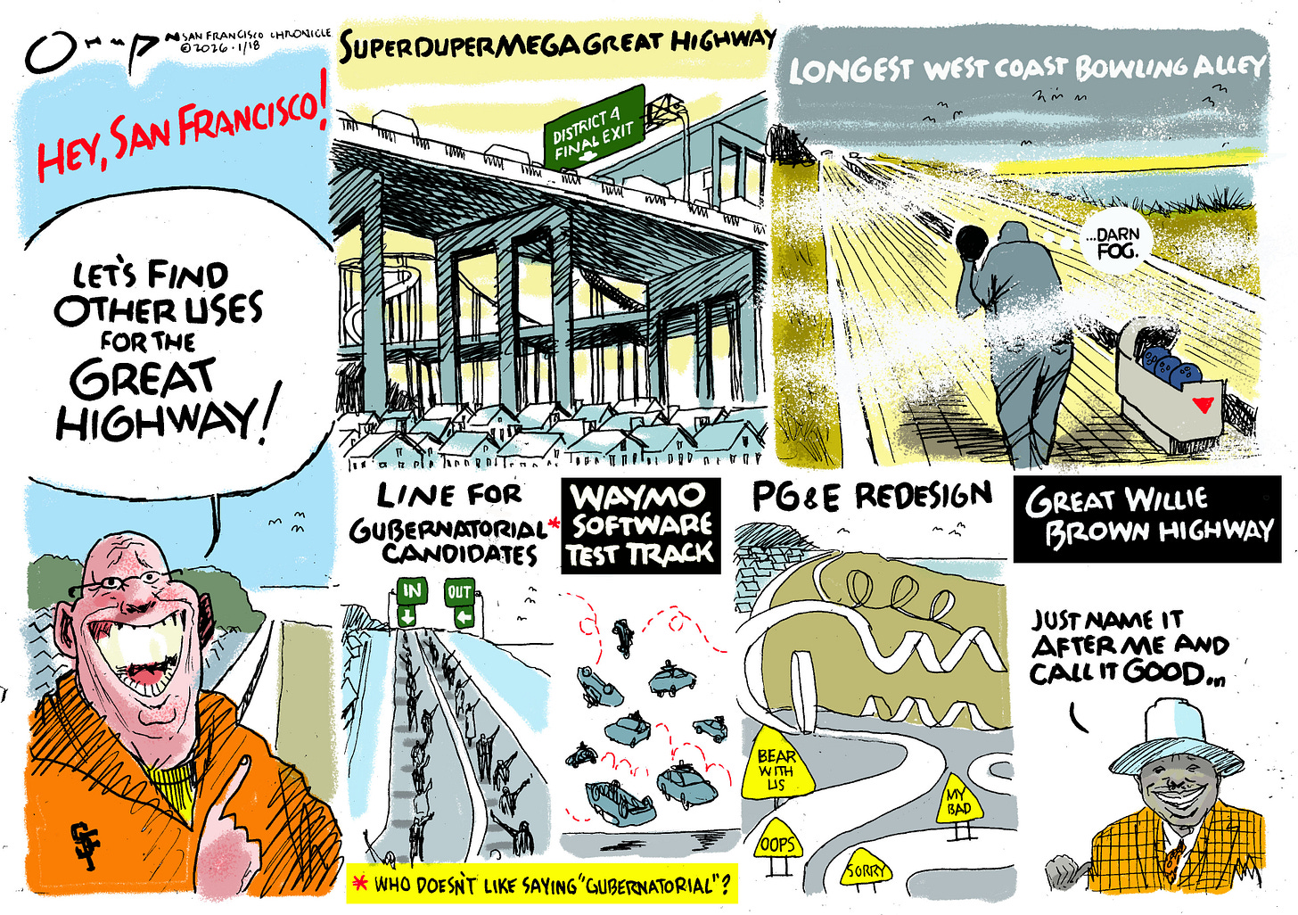 Just for fun, here’s my last week’s cartoon on SF’s star-crossed Great Highway, which The City can’t quite decide what to do with.