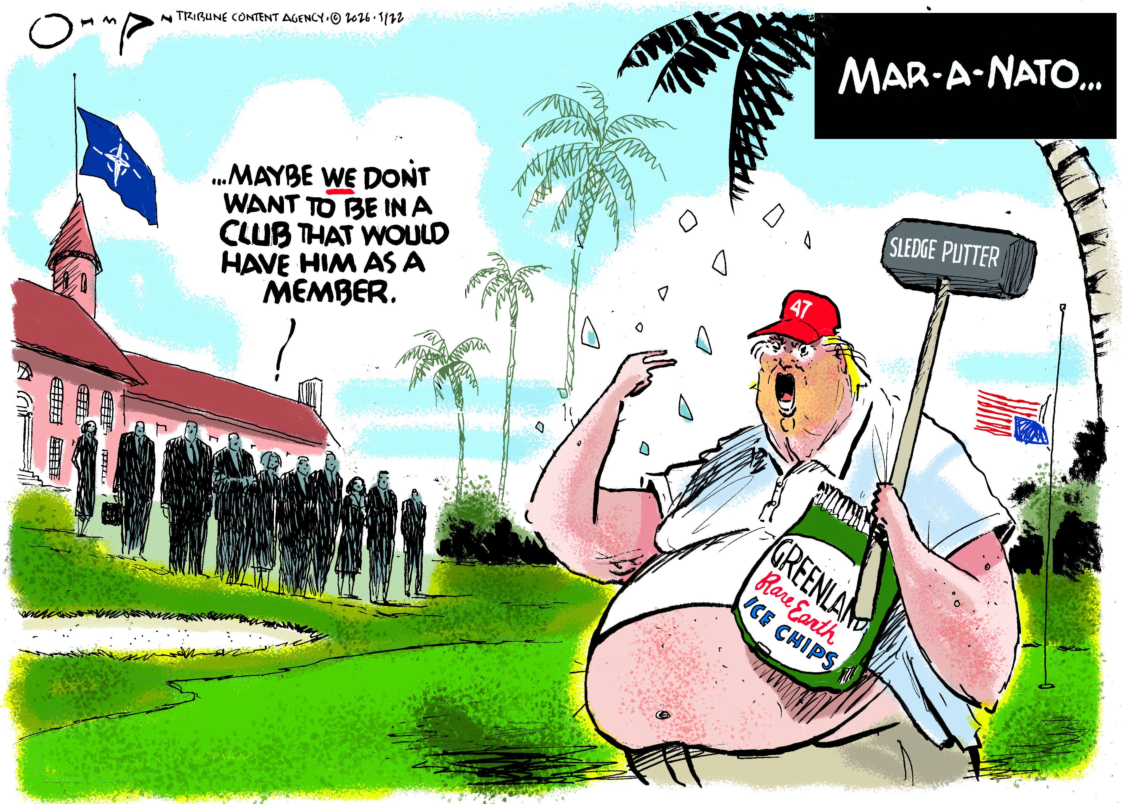 Drawing grass is the bane of my existence, and I have to draw a lot of grass, because Fat Ass is usually on the golf course. I don’t throw down a bunch of green and call it good. I put a yellow tone underneath, but getting that red-yellow-blue color balance is easy if Dipshit is in the cartoon: red tie, yellow hair, blue suit. Every other color is on the table.