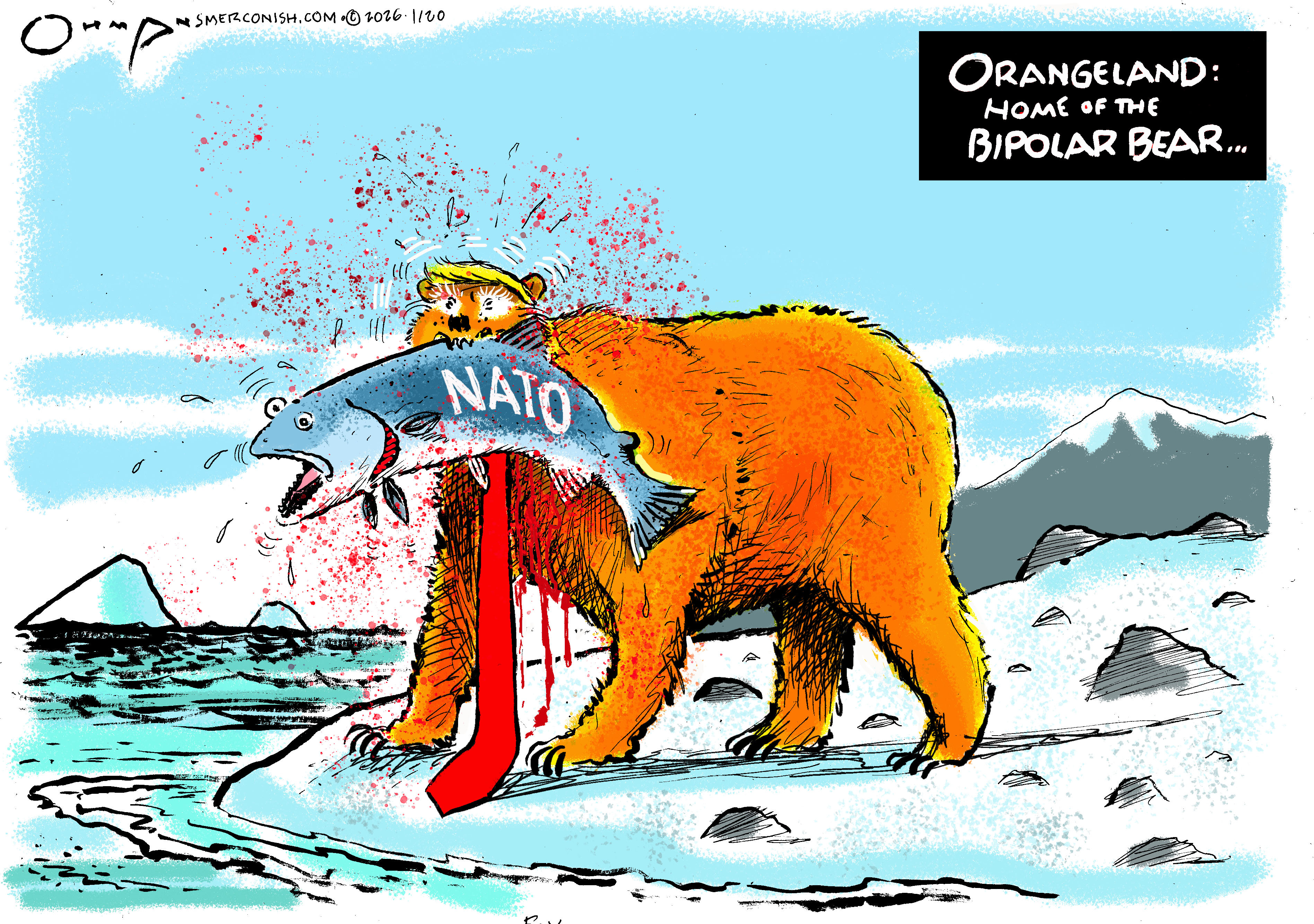 In using anthropomorphic imagery, sometimes the subjects face doesn’t quite match the animal’s facial structure. Here, it’s an OK fit. Not great. Good enough. I did enjoy doing this, and thought it apt. I won’t discuss the blood volume, but I think it’s about right. I did look at an actual polar bear photo in drawing this. I didn’t look at the fish, as I have drawn and written five fishing books—although I may have screwed up the fins. Want to buy one? Look HERE. I recommend An Inconvenient Trout and Angler Management. End of sales pitch.
